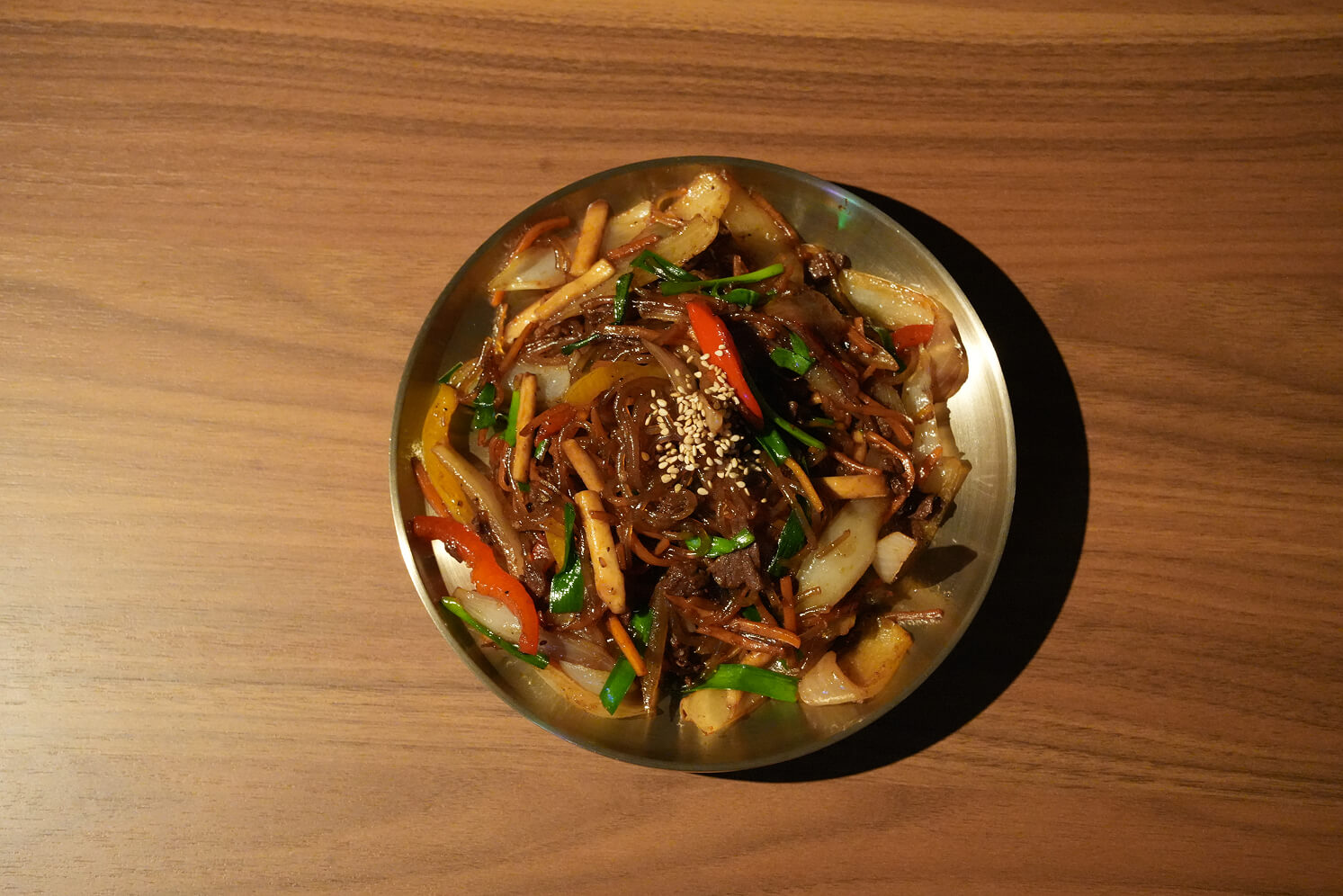 チャプチェとは、韓国の伝統的な家庭料理のひとつで、春雨(タンミョン)を主役に、牛肉、玉ねぎ、にんじん、きのこなどの野菜を炒め合わせ、甘辛く味付けした料理です。